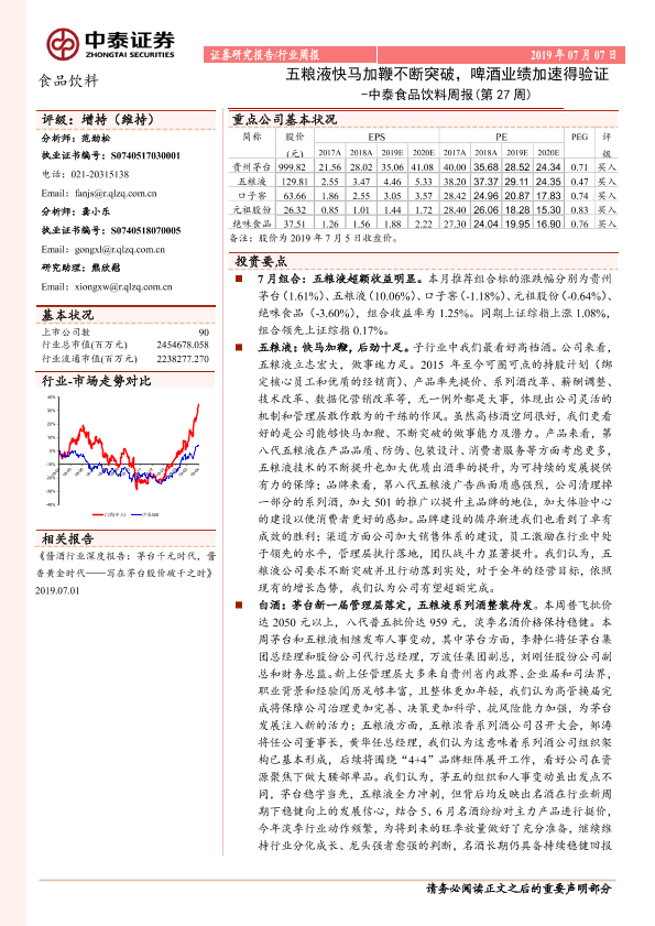【中泰证券】【20190707】中泰食品饮料周报(第27周):五粮液快马加鞭不断突破,啤酒业绩加速得验证-9页