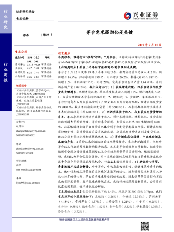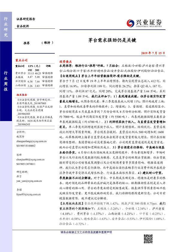 【兴业证券】【20190715】20190715-兴业证券-食品饮料行业周报:茅台需求强劲仍是关键-17页