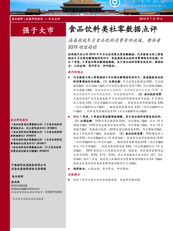 【中银证券】【20190715】食品饮料类社零数据点评:高基数致6月食品饮料消费有所放缓,整体看2Q19增速趋稳-4页