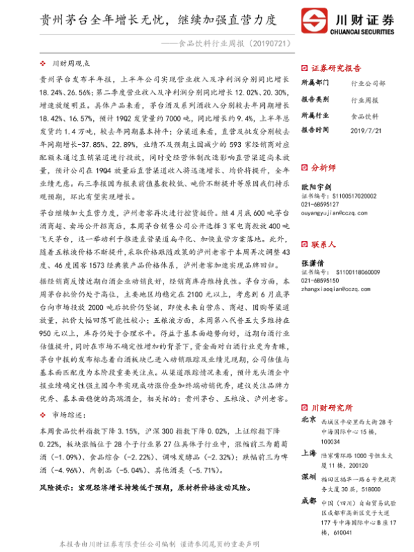 【川财证券】【20190721】食品饮料行业周报:贵州茅台全年增长无忧,继续加强直营力度-14页