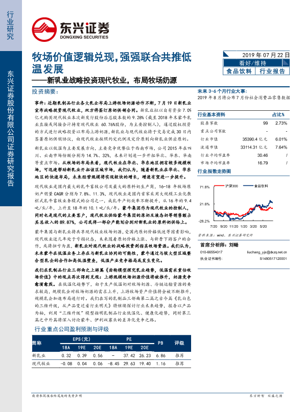 【东兴证券】【20190722】牧场价值逻辑兑现,强强联合共推低温发展:新乳业战略投资现代牧业,布局牧场奶源-4页