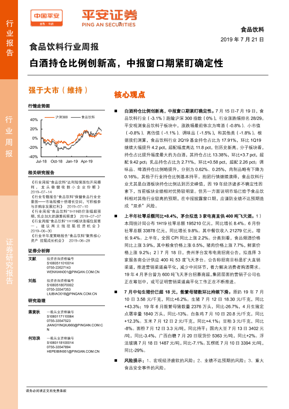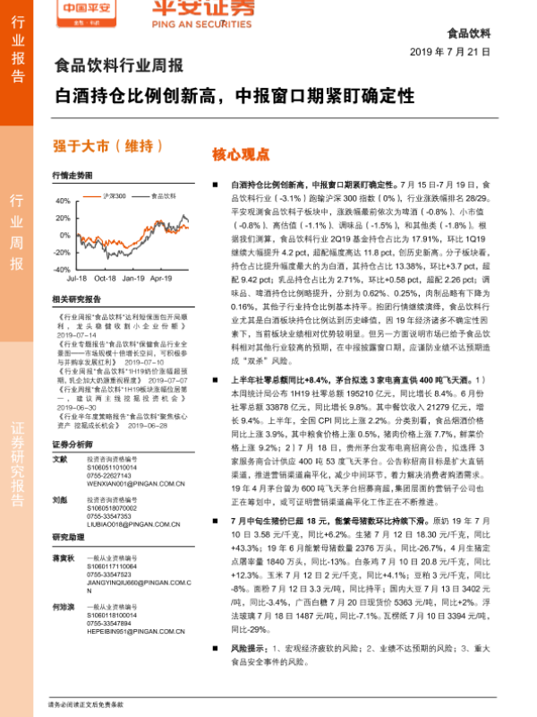【平安证券】【20190721】20190721-平安证券-食品饮料行业周报:白酒持仓比例创新高,中报窗口期紧盯确定性-6页