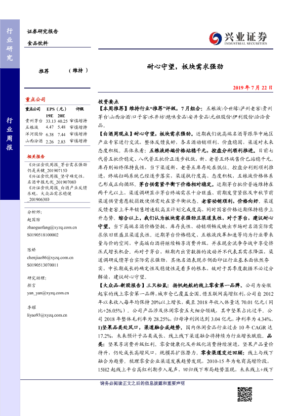 【兴业证券】【20190722】20190722-兴业证券-食品饮料行业周报:耐心守望,板块需求强劲-16页