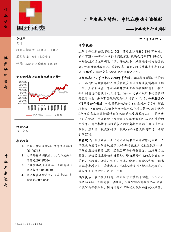 【国开证券】【20190723】20190723-国开证券-食品饮料行业周报:二季度基金增持,中报业绩确定性较强-9页