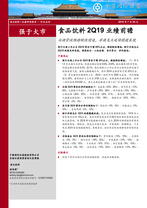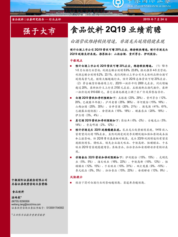 【中银证券】【20190724】食品饮料2Q19业绩前瞻:白酒营收维持较快增速,非酒龙头延续稳健表现-6页