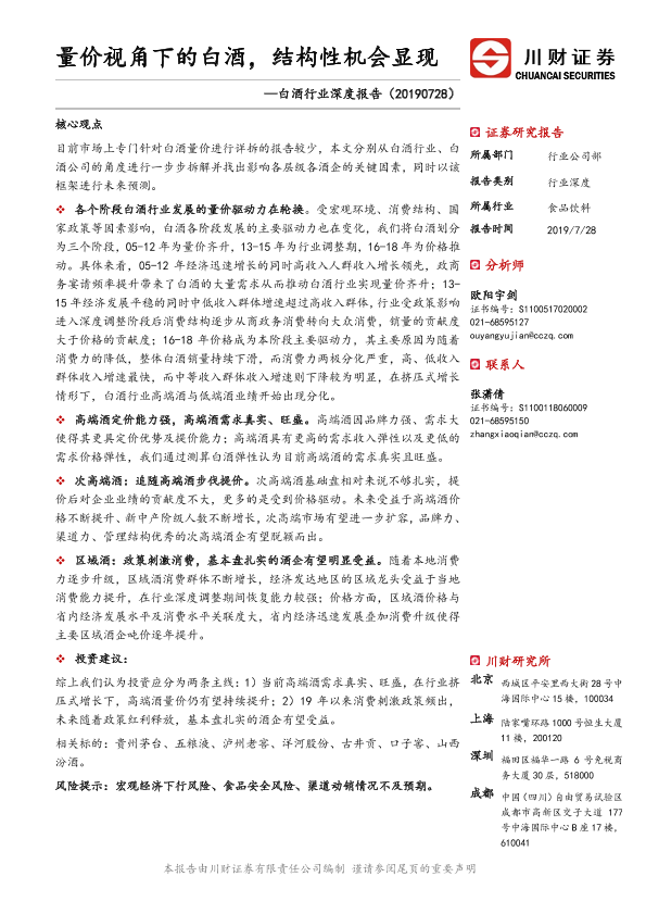 【川财证券】【20190728】食品饮料行业深度:量价视角下的白酒,结构性机会显现-28页