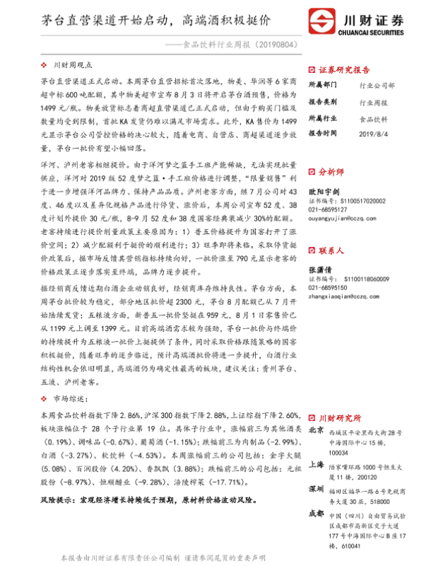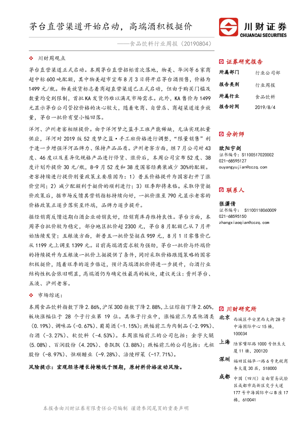 【川财证券】【20190804】食品饮料行业周报:茅台直营渠道开始启动,高端酒积极挺价-14页