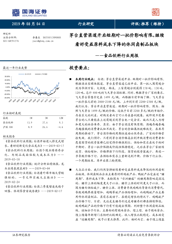 【国海证券】【20190804】20190804-国海证券-食品饮料行业周报:茅台直营渠道开启短期对一批价影响有限,继续看好受益原料成本下降的休闲卤制品板块-20页