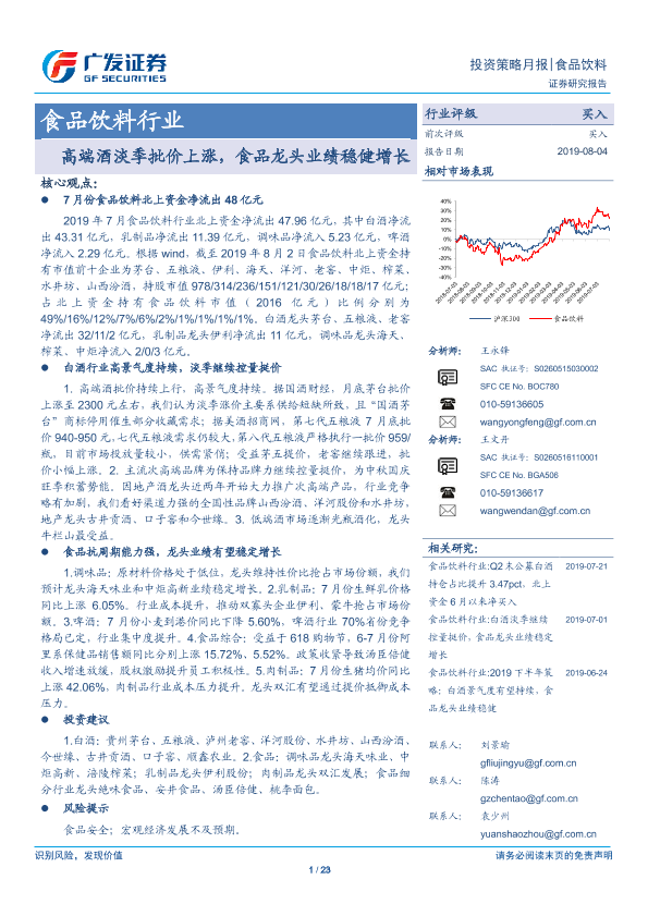 【广发证券】【20190804】20190804-广发证券-食品饮料行业投资策略月报:高端酒淡季批价上涨,食品龙头业绩稳健增长-23页