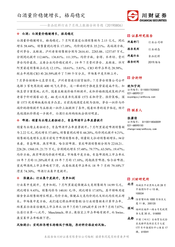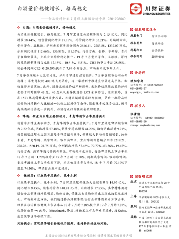 【川财证券】【20190806】食品饮料行业7月线上数据分析专题:白酒量价稳健增长,格局稳定-12页