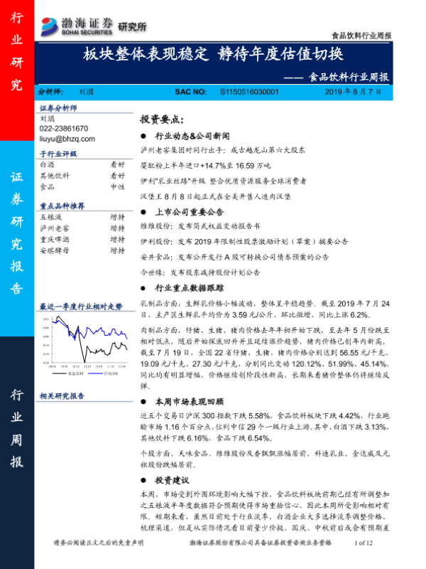 【渤海证券】【20190807】食品饮料行业周报:板块整体表现稳定 静待年度估值切换-12页