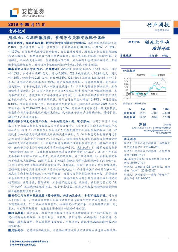【安信证券】【20190811】食品饮料周视点:白酒跑赢指数,贵州茅台关联交易靴子落地-19页