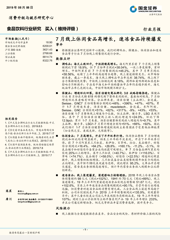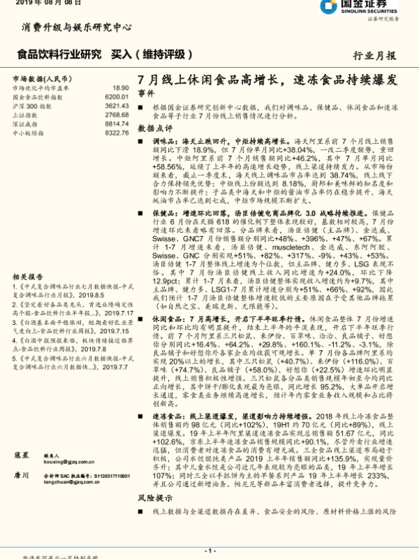【国金证券】【20190808】20190808-国金证券-食品饮料行业研究:7月线上休闲食品高增长,速冻食品持续爆发-17页