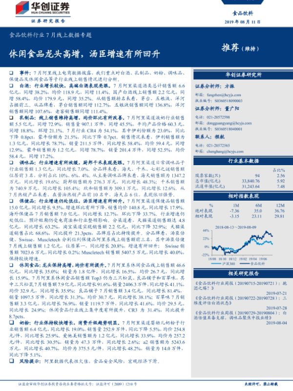 【华创证券】【20190811】食品饮料行业7月线上数据专题:休闲食品龙头高增,汤臣增速有所回升-19页