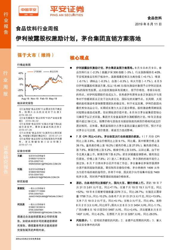 【平安证券】【20190811】食品饮料行业周报:伊利披露股权激励计划,茅台集团直销方案落地-6页