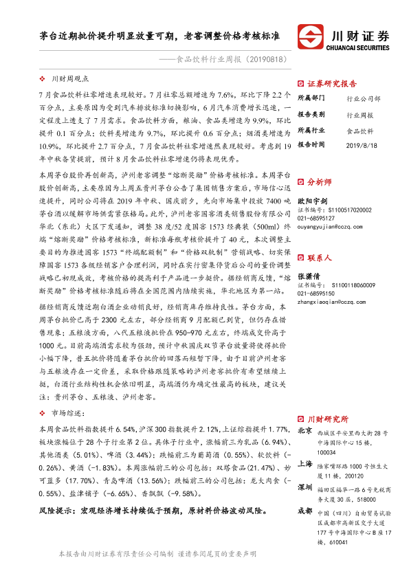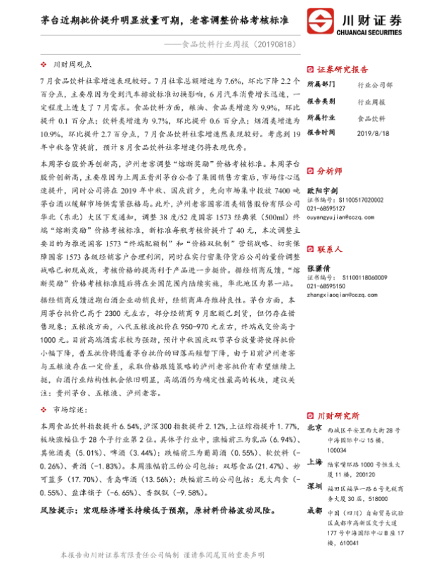 【川财证券】【20190818】20190818-川财证券-食品饮料行业周报:茅台近期批价提升明显放量可期,老窖调整价格考核标准-14页