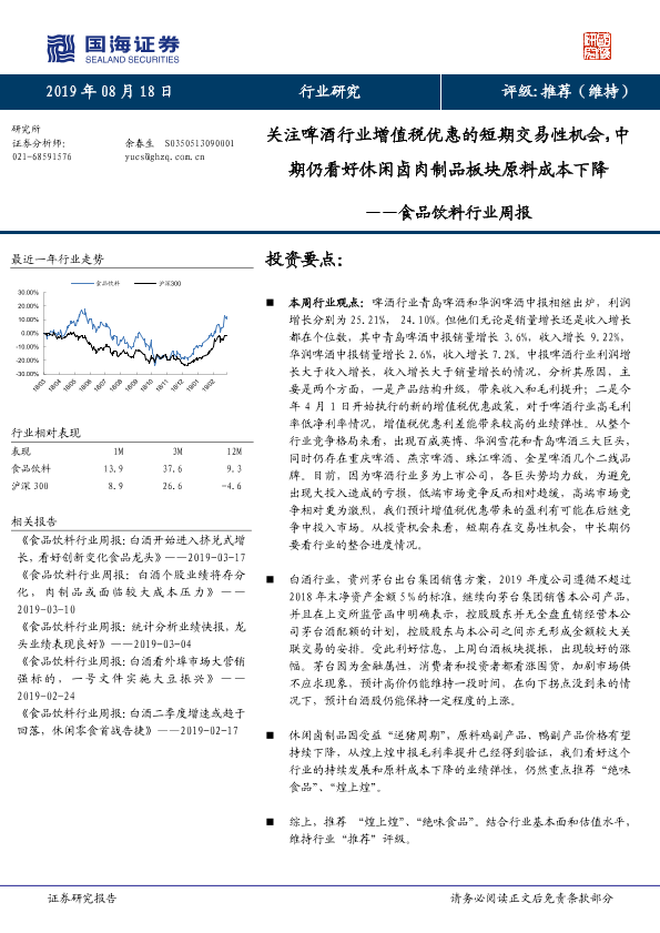 【国海证券】【20190818】20190818-国海证券-食品饮料行业周报:关注啤酒行业增值税优惠的短期交易性机会,中期仍看好休闲卤肉制品板块原料成本下降-20页