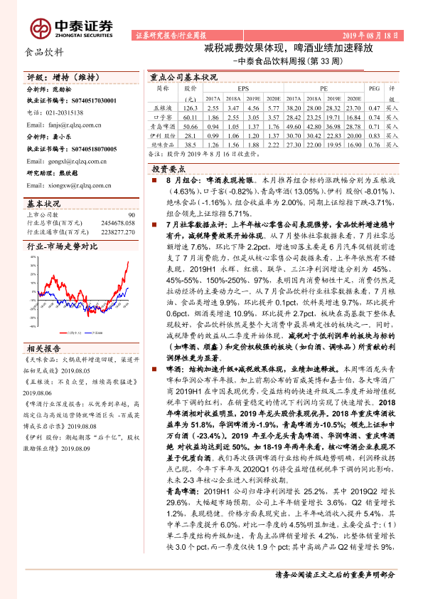【中泰证券】【20190818】食品饮料行业周报(第33周):减税减费效果体现,啤酒业绩加速释放-12页