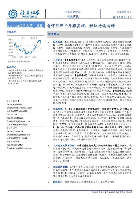 【海通证券】【20190819】20190819-海通证券-食品行业周报:青啤润啤半年报高增,板块持续向好-12页