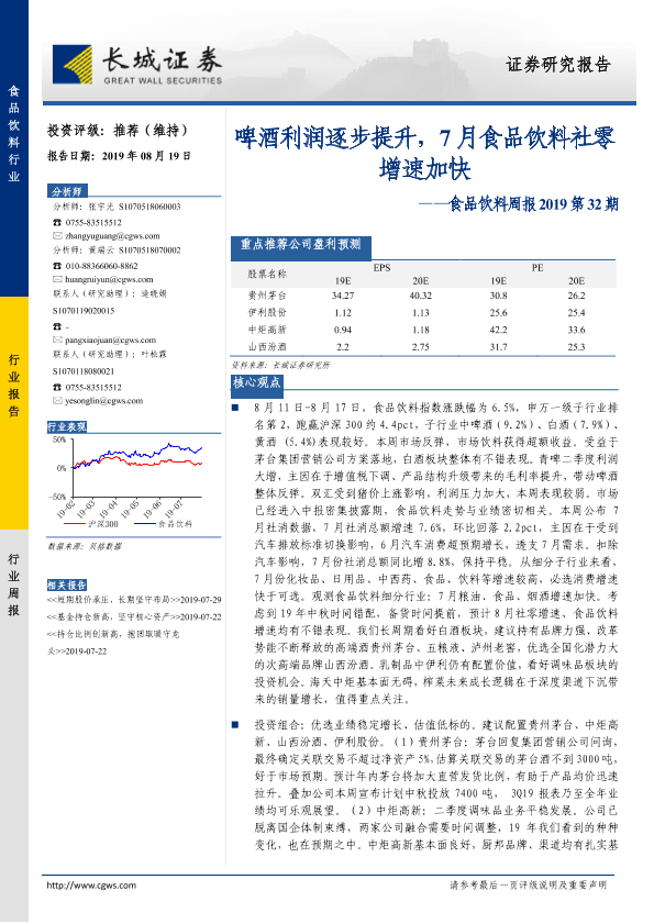 【长城证券】【20190819】食品饮料周报2019第32期:啤酒利润逐步提升,7月食品饮料社零增速加快-14页