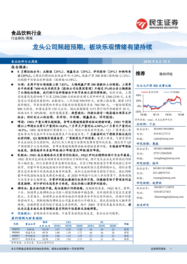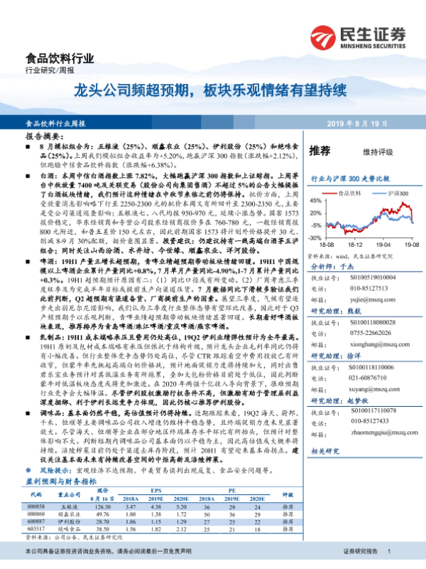 【民生证券】【20190819】20190819-民生证券-食品饮料行业:龙头公司频超预期,板块乐观情绪有望持续-24页