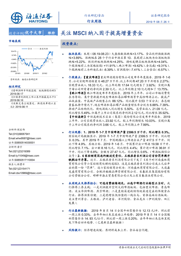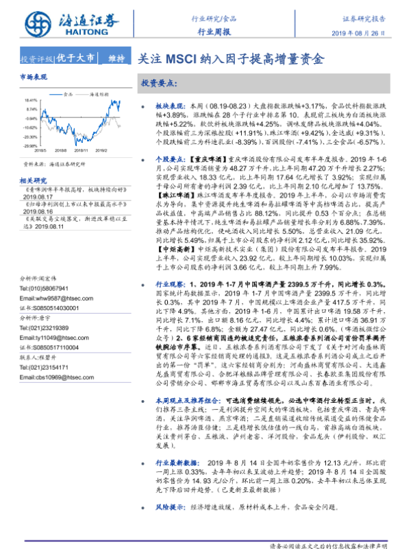 【海通证券】【20190826】20190826-海通证券-食品行业周报:关注MSCI纳入因子提高增量资金-12页