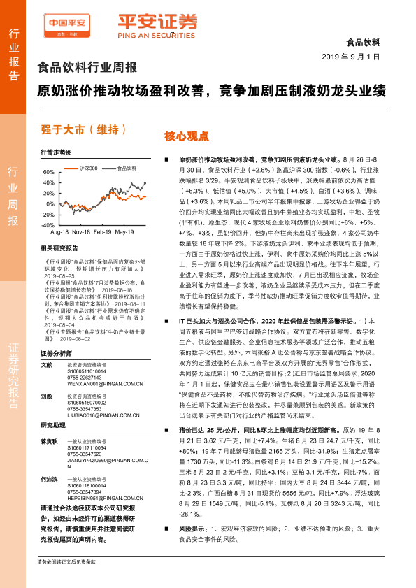 【平安证券】【20190901】食品饮料行业周报:原奶涨价推动牧场盈利改善,竞争加剧压制液奶龙头业绩-6页