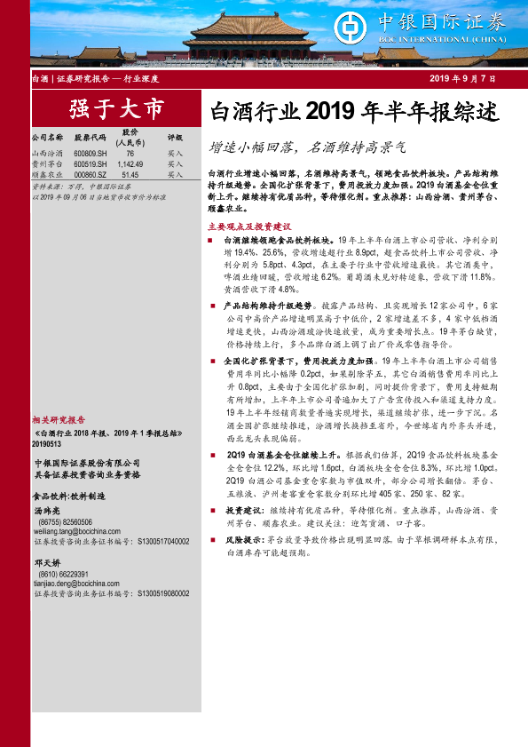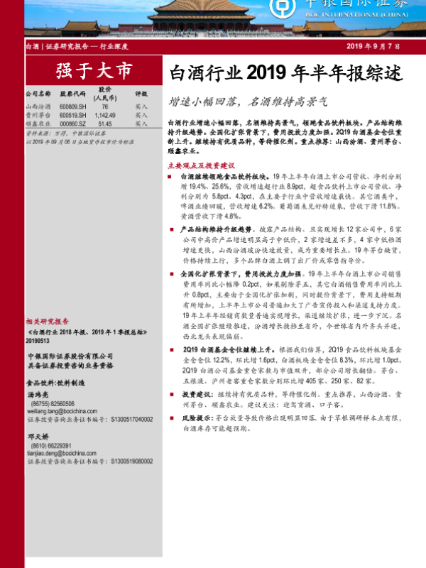 【中银证券】【20190907】白酒行业2019年半年报综述:增速小幅回落,名酒维持高景气-26页