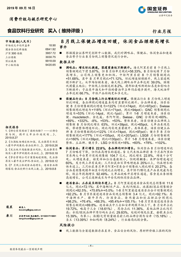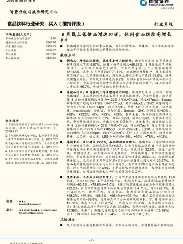 【国金证券】【20190916】20190916-国金证券-食品饮料行业研究月报:8月线上保健品增速回暖,休闲食品继续高增长-16页