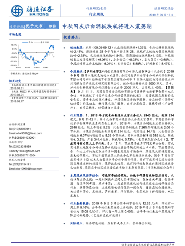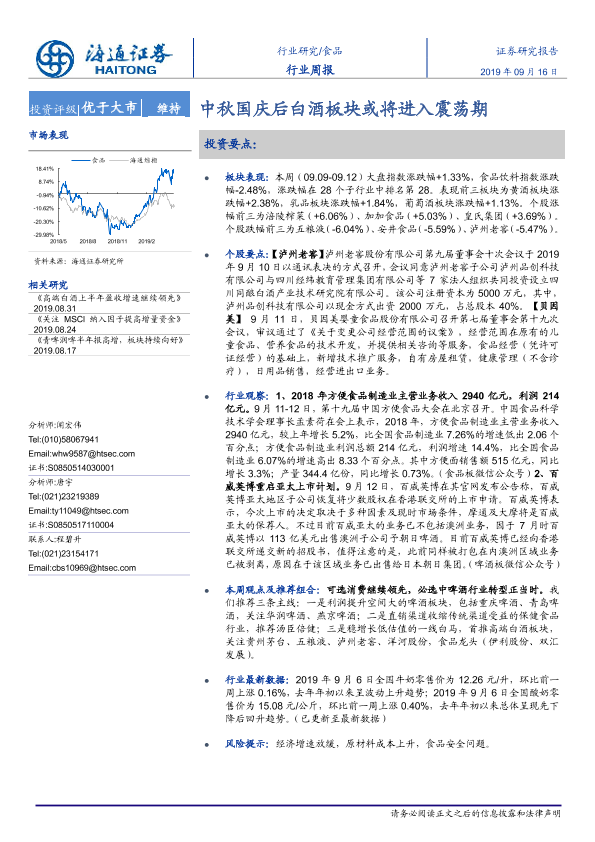 【海通证券】【20190916】20190916-海通证券-食品行业周报:中秋国庆后白酒板块或将进入震荡期-12页