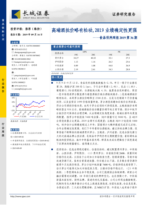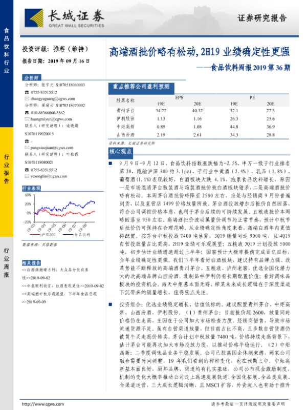 【长城证券】【20190916】20190916-长城证券-食品饮料周报2019第36期:高端酒批价略有松动,2H19业绩确定性更强-12页
