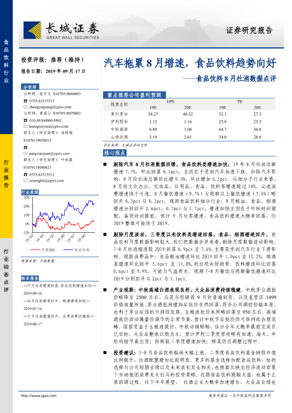 【长城证券】【20190917】食品饮料8月社消数据点评:汽车拖累8月增速,食品饮料趋势向好-3页