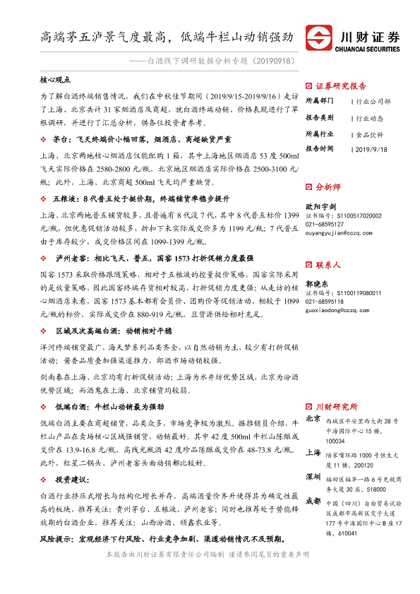 【川财证券】【20190918】20190918-川财证券-白酒线下调研数据分析专题:高端茅五泸景气度最高,低端牛栏山动销强劲-15页