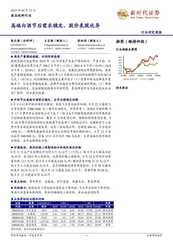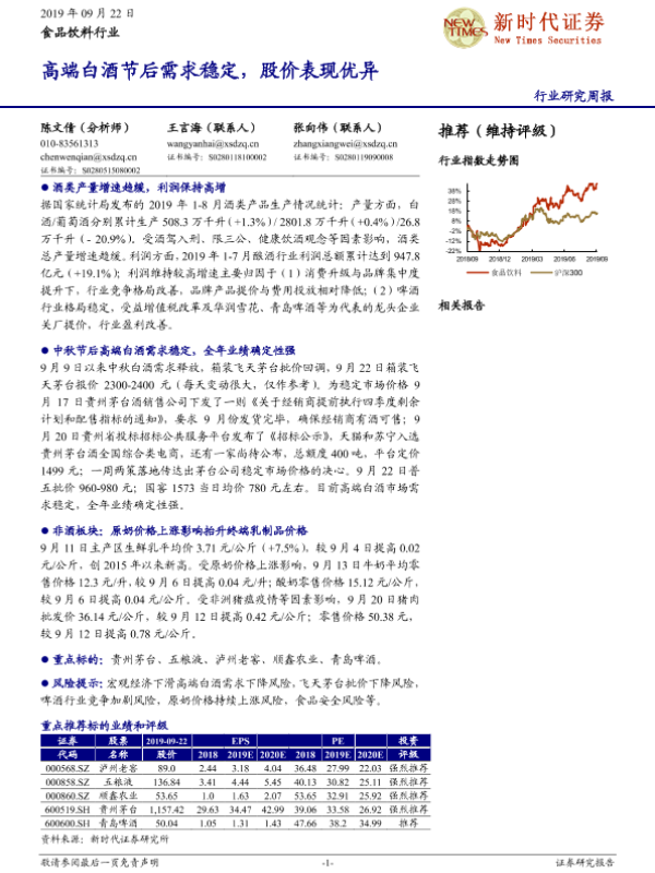 【新时代证券】【20190922】食品饮料行业周报:高端白酒节后需求稳定,股价表现优异-19页