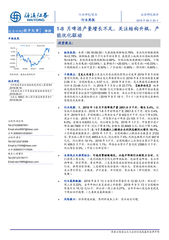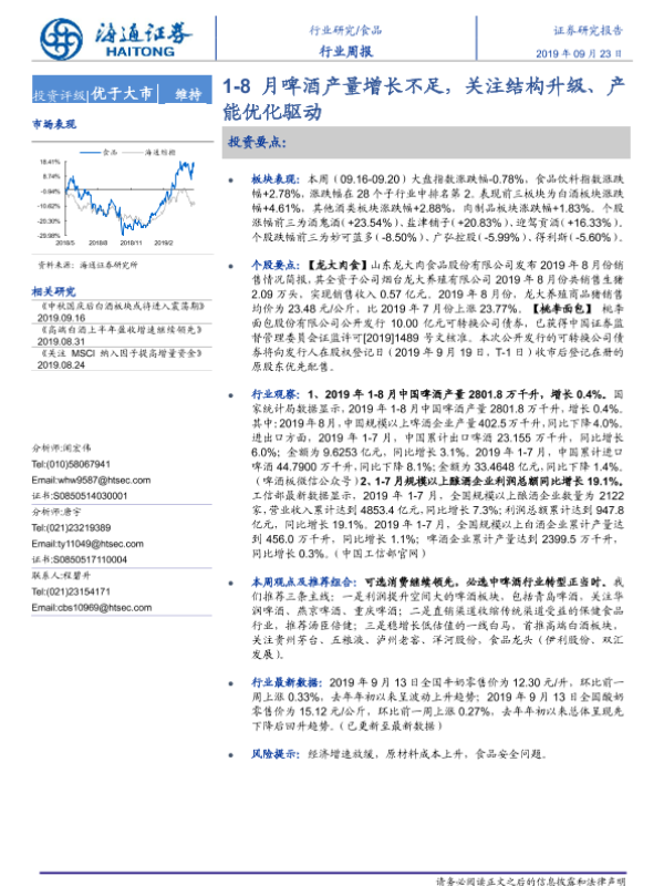 【海通证券】【20190923】20190923-海通证券-食品行业周报:1-8月啤酒产量增长不足,关注结构升级、产能优化驱动-11页