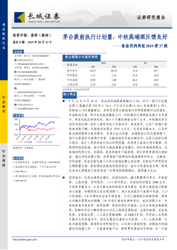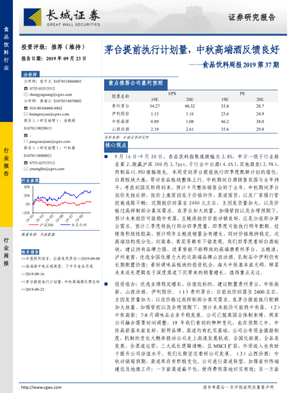 【长城证券】【20190923】20190923-长城证券-食品饮料周报2019第37期:茅台提前执行计划量,中秋高端酒反馈良好-11页