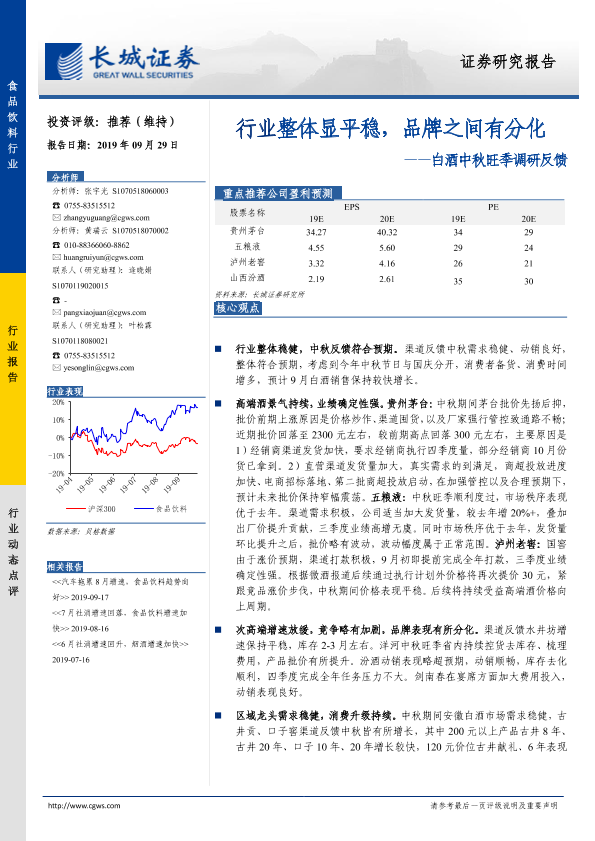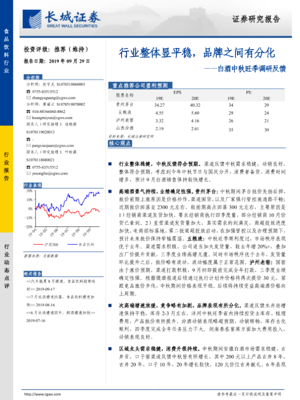 【长城证券】【20190929】白酒中秋旺季调研反馈:行业整体显平稳,品牌之间有分化-3页