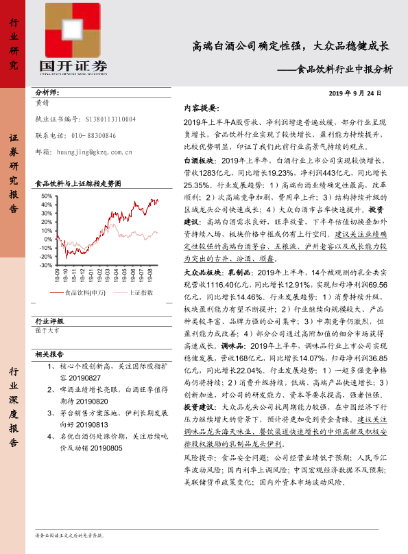 【国开证券】【20190924】食品饮料行业中报分析:高端白酒公司确定性强,大众品稳健成长-21页