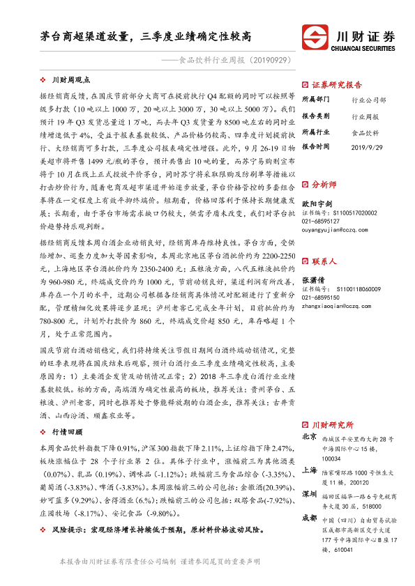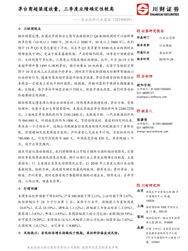 【川财证券】【20190929】食品饮料行业周报:茅台商超渠道放量,三季度业绩确定性较高-14页