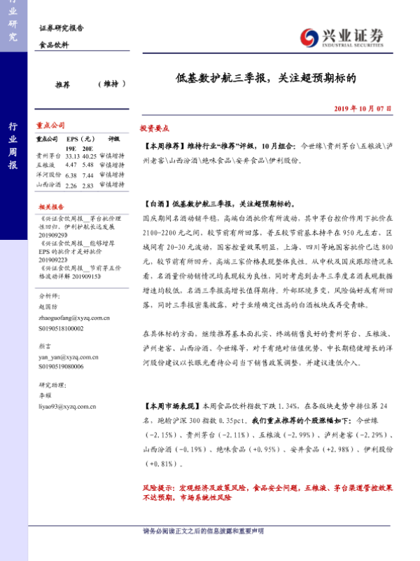 【兴业证券】【20191007】20191007-兴业证券-食品饮料行业周报:低基数护航三季报,关注超预期标的-15页