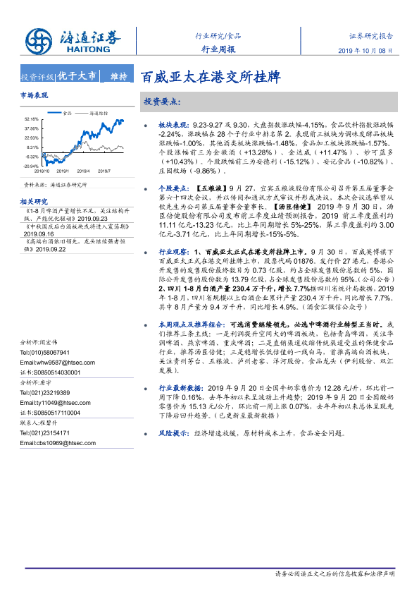 【海通证券】【20191008】20191008-海通证券-食品行业周报:百威亚太在港交所挂牌-10页