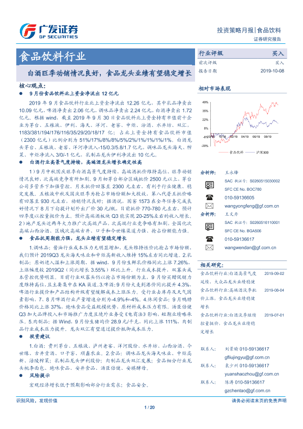 【广发证券】【20191008】20191008-广发证券-食品饮料行业投资策略月报:白酒旺季动销情况良好,食品龙头业绩有望稳定增长-20页