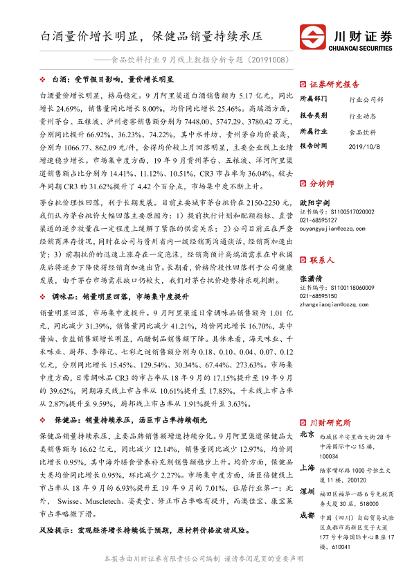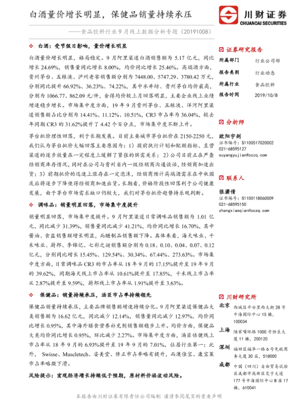 【川财证券】【20191008】食品饮料行业9月线上数据分析专题:白酒量价增长明显,保健品销量持续承压-12页