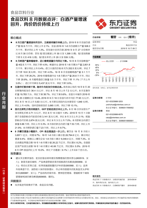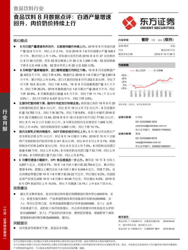 【东方证券】【20191009】食品饮料8月数据点评:白酒产量增速回升,肉价奶价持续上行-14页