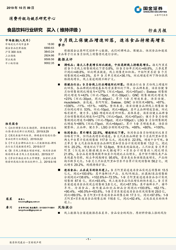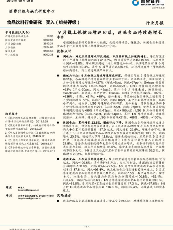 【国金证券】【20191009】20191009-国金证券-食品饮料行业研究月报:9月线上保健品增速回落,速冻食品持续高增长-12页