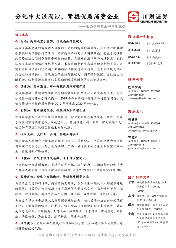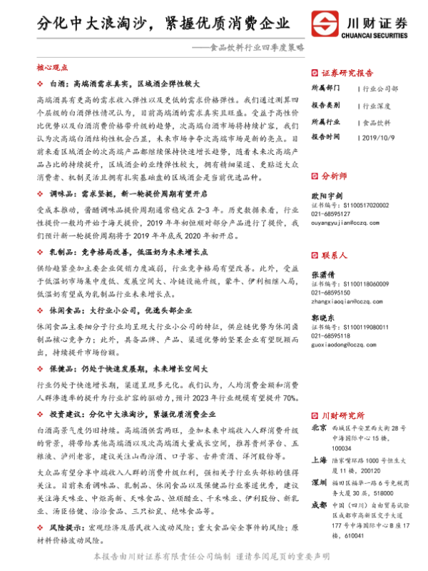 【川财证券】【20191009】食品饮料行业四季度策略:分化中大浪淘沙,紧握优质消费企业-41页