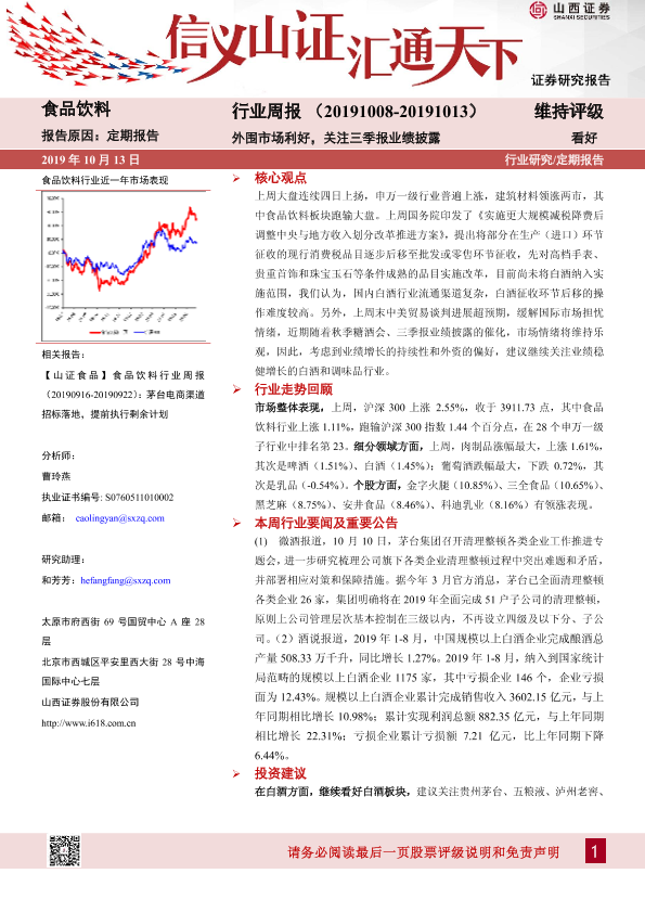 【山西证券】【20191013】食品饮料行业周报:外围市场利好,关注三季报业绩披露-10页