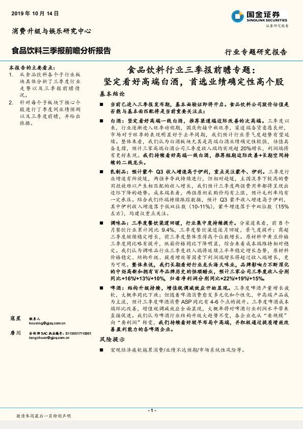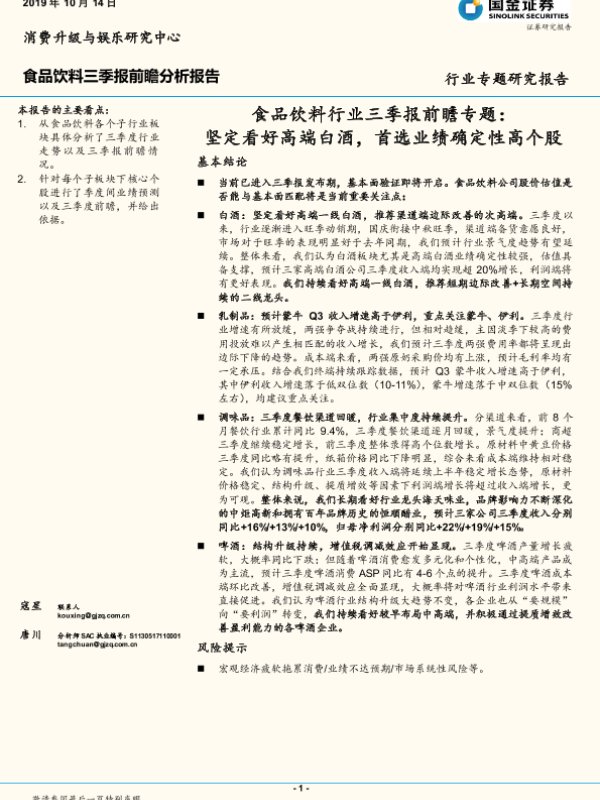 【国金证券】【20191014】食品饮料行业三季报前瞻专题:坚定看好高端白酒,首选业绩确定性高个股-15页