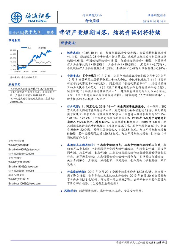 【海通证券】【20191014】20191014-海通证券-食品行业周报:啤酒产量短期回落,结构升级仍将持续-11页