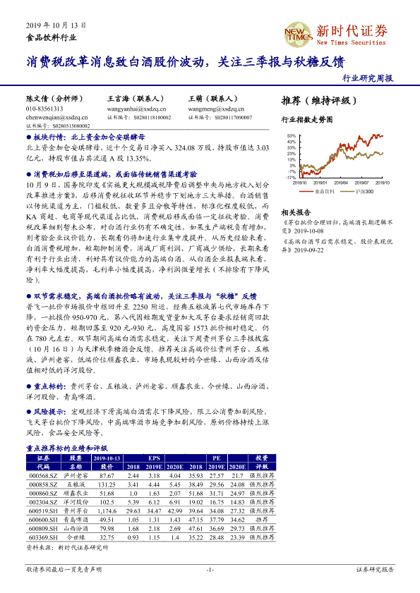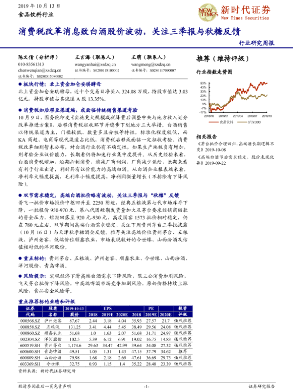 【新时代证券】【20191013】20191013-新时代证券-食品饮料行业研究周报:消费税改革消息致白酒股价波动,关注三季报与秋糖反馈-15页